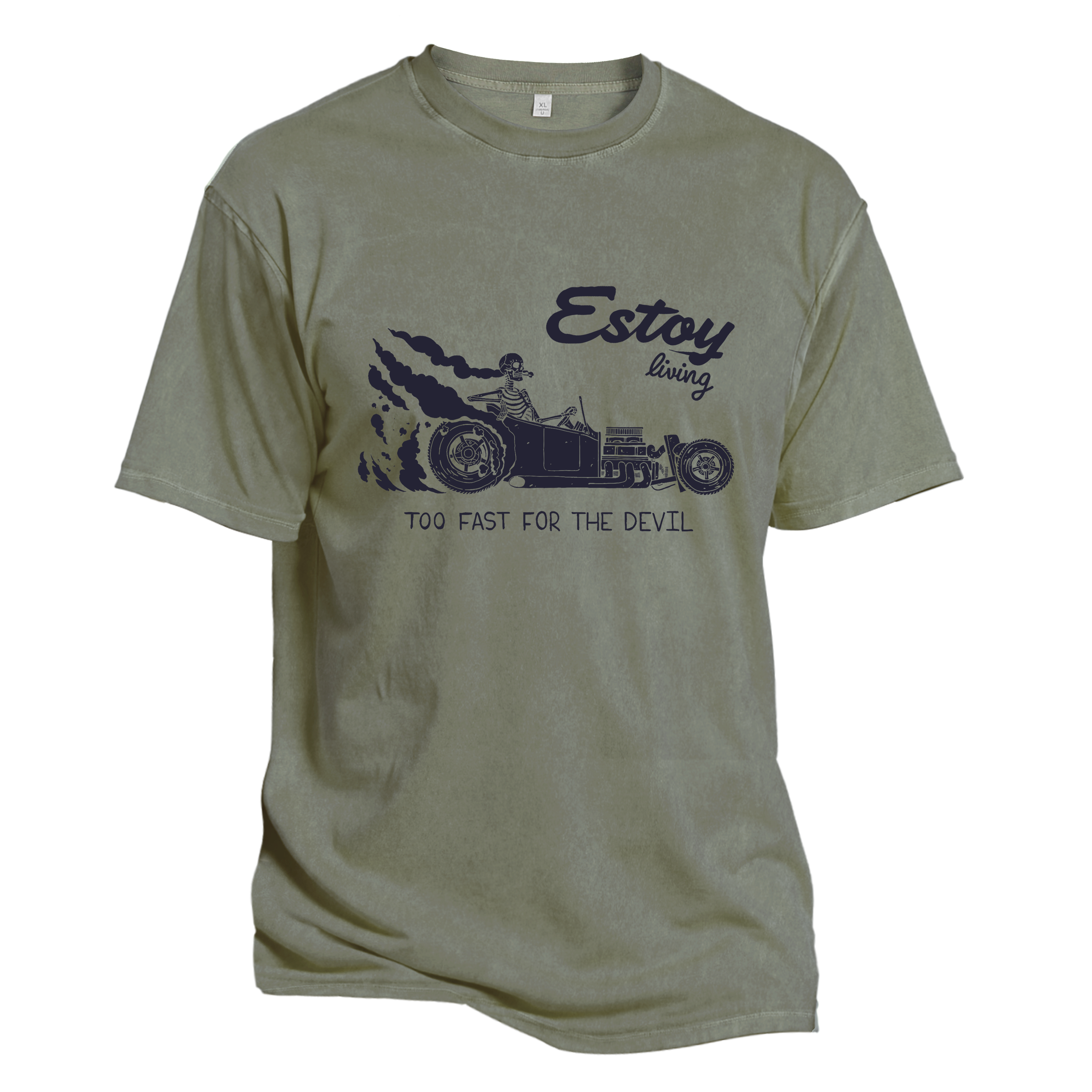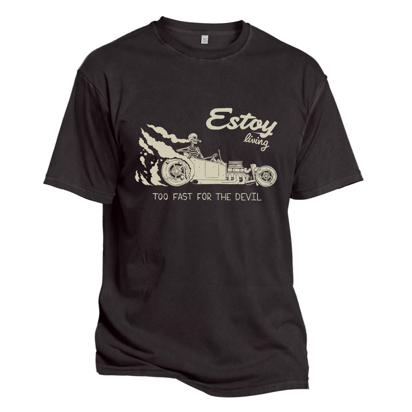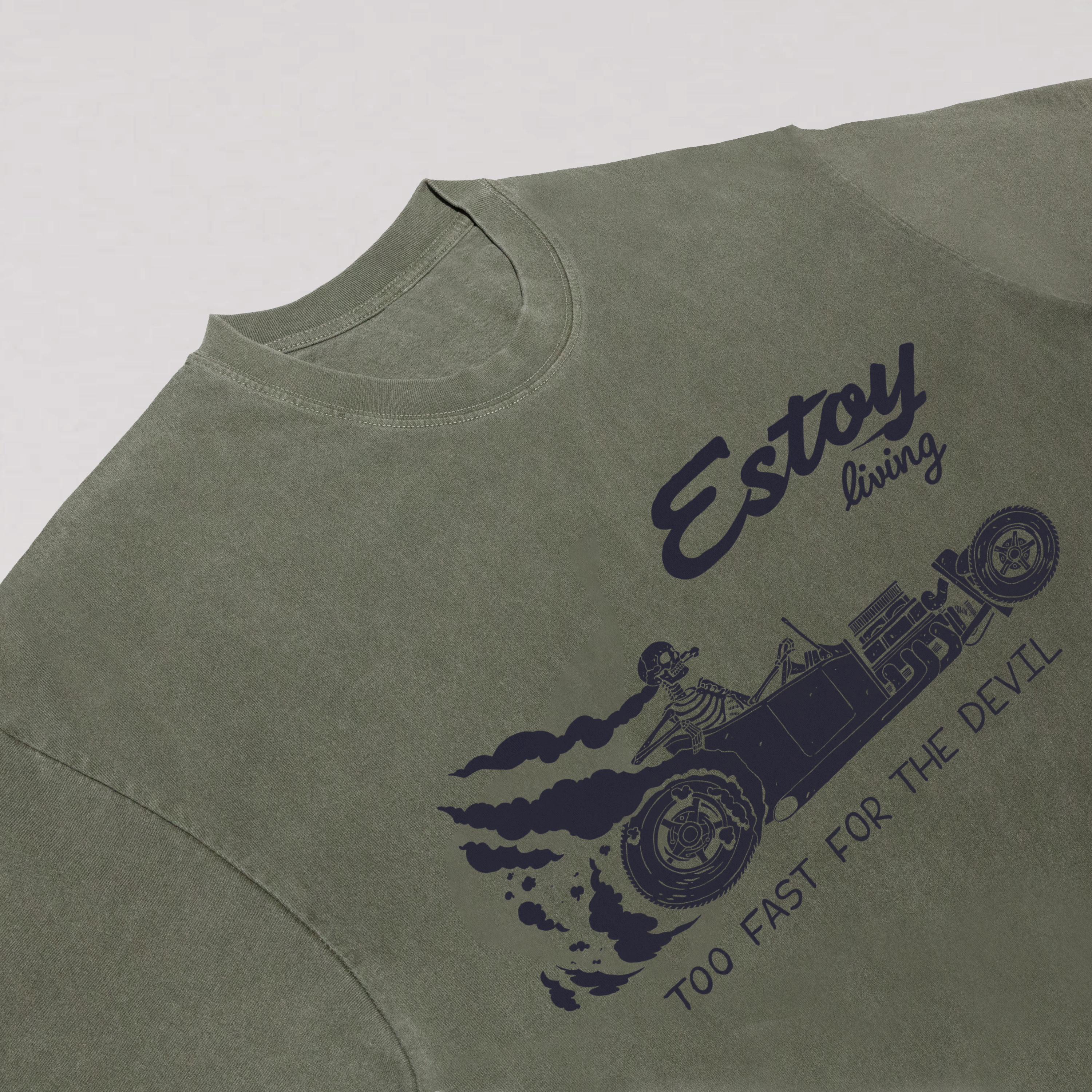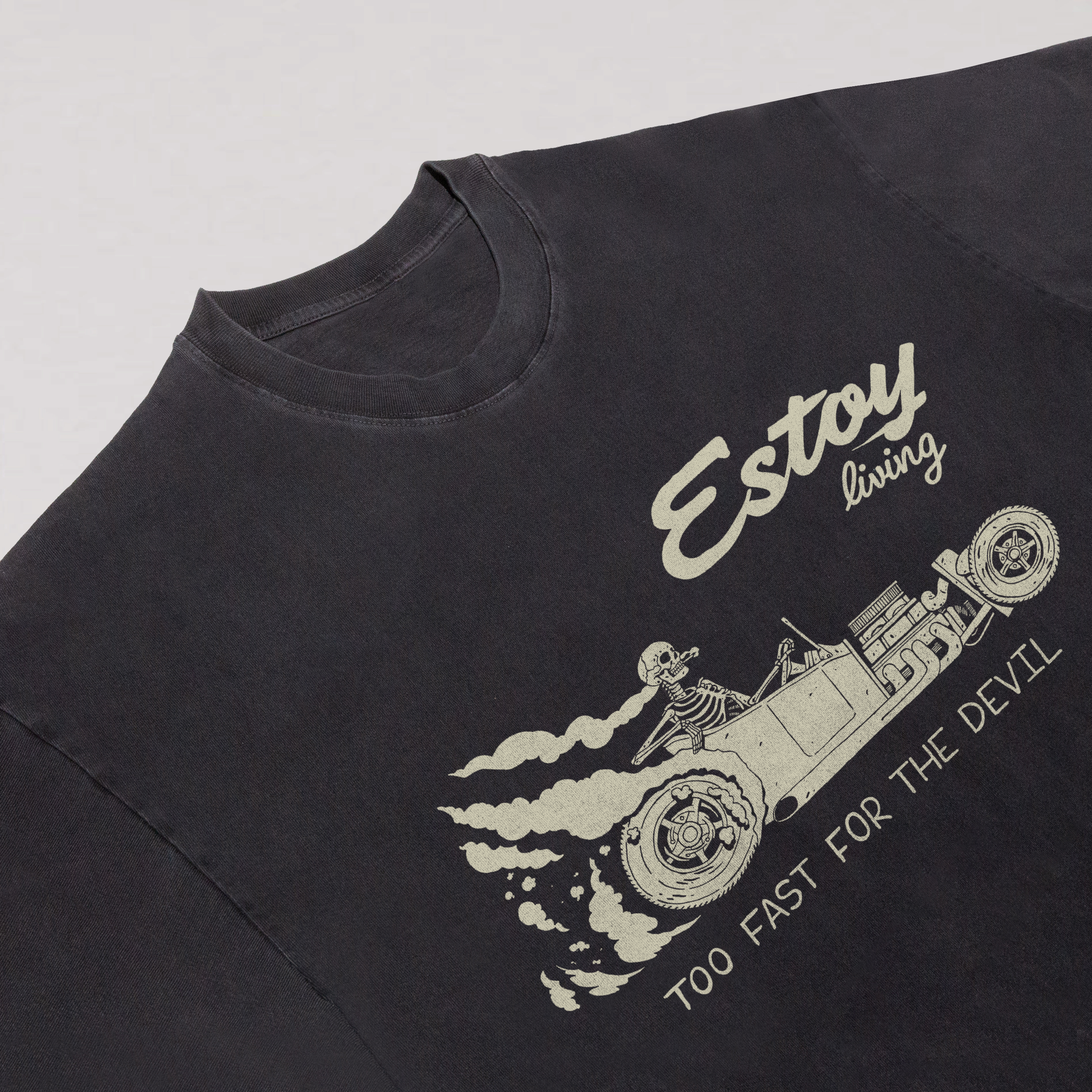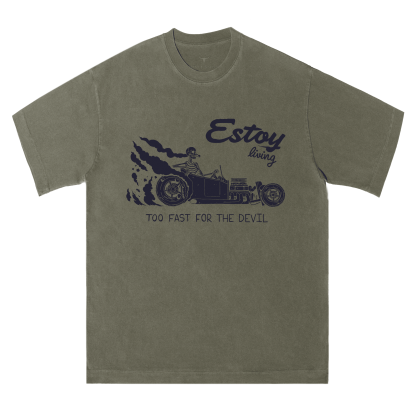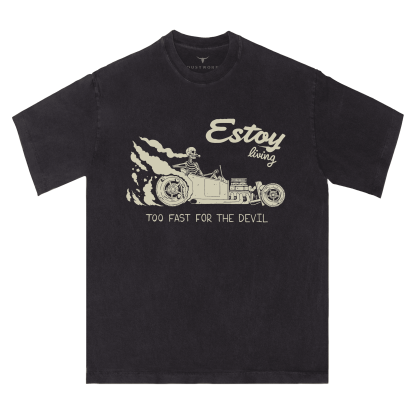 ❤This tee features a skeleton behind the wheel. tearing down the road with wild energy. Emblazoned with the phrases “Estoy living” and “TOO FAST FOR THE DEVIL.” it captures a fearless. fast-living attitude. The graphic blends dark humor and bold street energy. perfect for those who live loud. fast. and unapologetically.❤