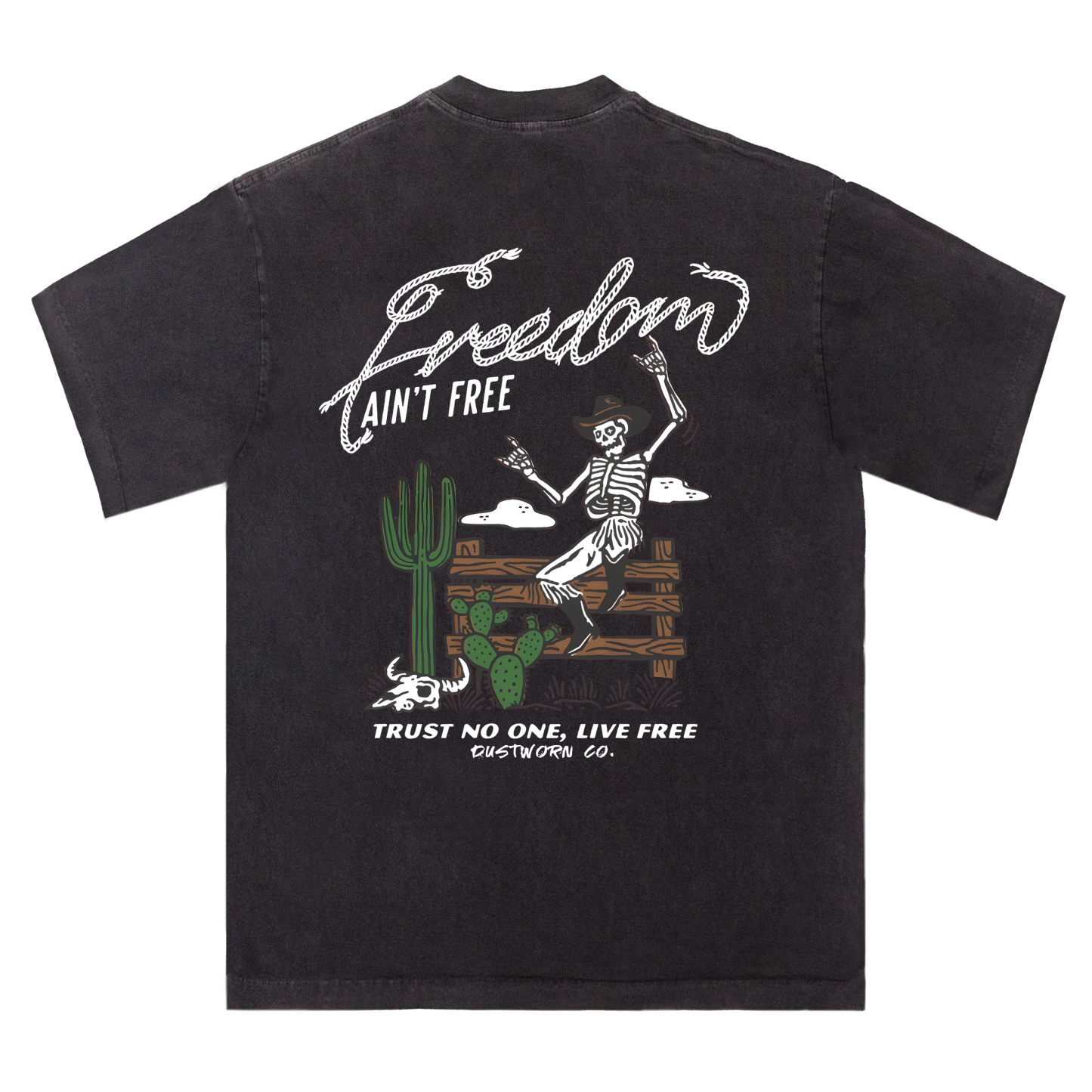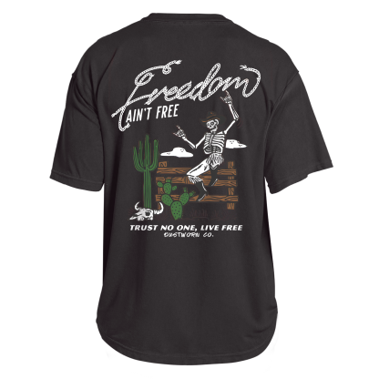 ❤This tee features a bold skeleton cowboy dancing at a fence 💀🕺. surrounded by cacti🌵 and a bull skull. with the striking slogans: “FREEDOM AIN'T FREE” and “TRUST NO ONE. LIVE FREE.” The rough. hand-drawn style captures a gritty Western punk vibe—perfect for those who live wild. trust few. and never settle. Wear it like you mean it—freedom comes at a cost. but style doesn't.❤